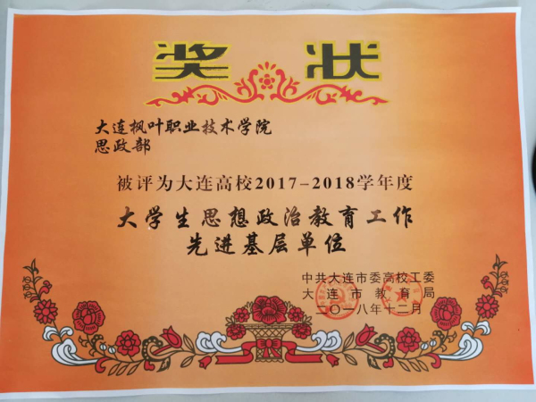为深入学习贯彻党的十九大精神和习近平新时代中国特色社会主义思想,大连枫叶职业技术学院思想政治理论课教学部(简称思政部)在党委领导下开展了一系列思想政治教育工作,一年来在思政教学工作和省级大赛中取得了可喜的成绩。2018年12月被中共大连市委高校工委评为“大连高校2017-2018学年大学生思想政治教育工作先进基层单位”,思政部于杨老师被评为2017-2018学年度“大连市优秀学生思想政治教育工作者”