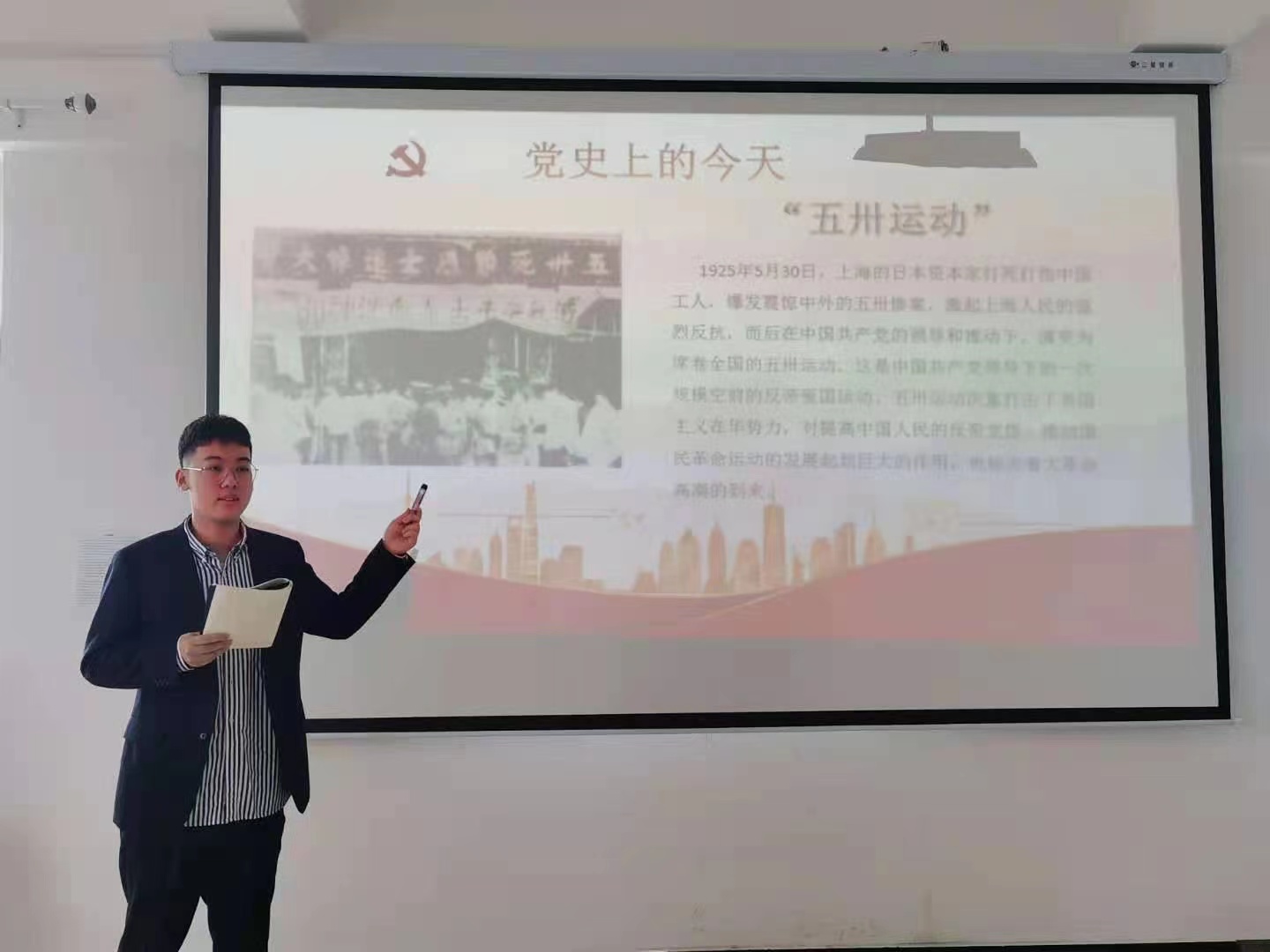 为营造“深入学习四史、践行初心使命”的良好氛围,发挥学生的主动性, 我院思政部在课堂上开展“重温“四史”上的今天”活动,每节课课前由学生上台分享“四史”上的今天,旨在让学生重温党的光辉历史,回顾党的光辉历程。