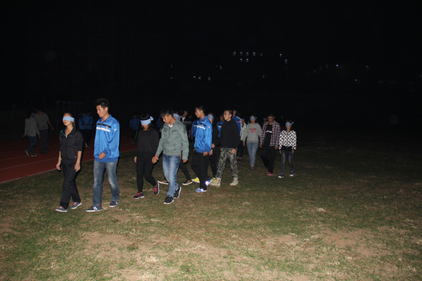 在主教练刺青的带领下,所有成员分为两队,“贡献者”与“享受者”享受者们戴上了眼罩,眼前一片漆黑,在贡献者的带领下一点点下楼、上楼、迈过门槛等。就这样贡献者与享受者相互配合,虽然不允许有语言沟通、但靠着他们之间的默契,就这样坎坎坷坷的第一段路走完了。