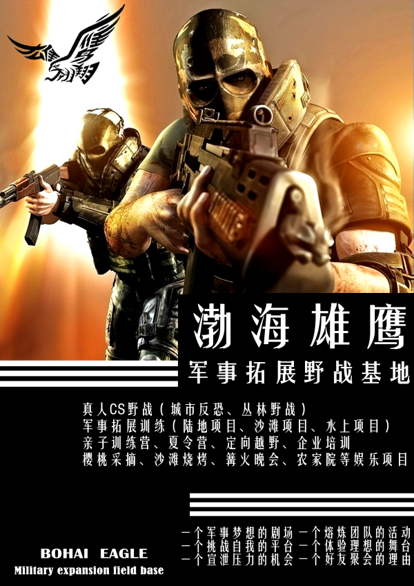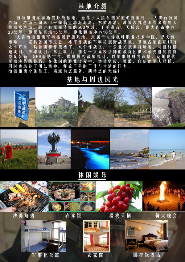 大连渤海雄鹰军事拓展野战基地,隶属于大连枫叶职业技术学院,是大连市唯一一家具备城市反恐、楼宇作战的军事拓展野战基地,基地占地面积10万余平方米,具备四栋作战楼宇,六个作战区,十余处拓展训练场地,可进行陆地项目、沙滩项目、水上项目,拥有一支高校讲师的教练团队和最先进的仿真激光装备,GPS遥感定位、微机操控战损统计,以军事题材为背景,运用现代军事演练的技巧,在休闲的游戏过程中,塑造坚毅、果敢、自信的军人品质,同时也培养了团队精神,释放了平时工作与生活的压力。