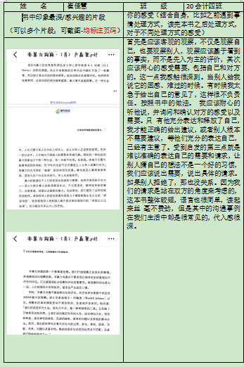 在本次读书会之前,老师建立钉钉读书小组群,同学们用一周时间阅读了《非暴力沟通》这本书籍,每日积极打卡,并把阅读感受写在了读书打卡表上。