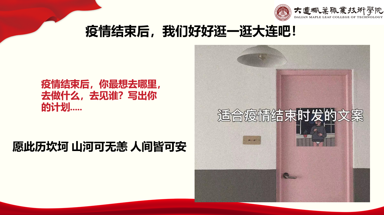 目前,全国疫情防控正处在形势复杂期、任务攻坚期。关键时刻,最能见担当、见能力、见作风。大连枫叶职业技术学院全体师生不畏风浪,直面挑战,经受住了淬火考验,全力以赴战胜疫情。尽天职,遂人愿,让我们共同期待,风雨过后,春暖花开的盛放。