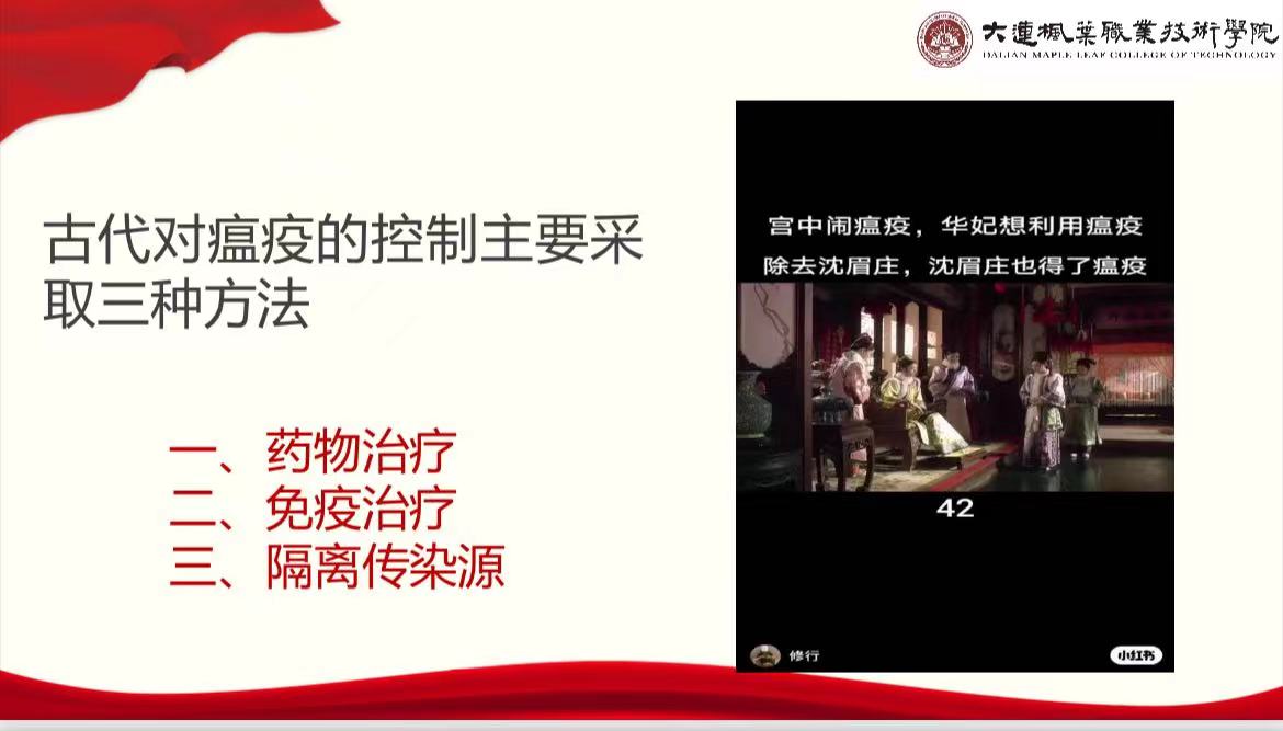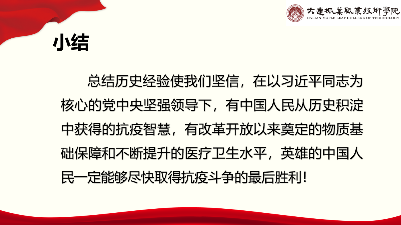 疫情防控就是集结号,党旗飘扬就是指航针。防控战“疫”正当进行时,大连枫叶职业技术学院严格落实联防联控、群防群控各项措施,组织全院干部,教师带头坚守防“疫”一线,在大战大考中彰显强大组织力,用实际行动为学生筑起一道坚固的疫情防控“红色防线”。马克思主义学院于4月11日在钉钉线上开起第四期专题讲座“疫情防控”思政大课堂讲座——“汲取历史智慧打赢疫情防控攻坚战”。