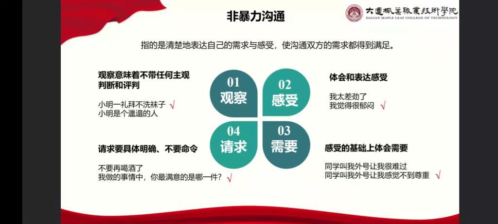 李香凝老师向同学介绍一种有效沟通的方式——非暴力沟通。通过寝室常见问题引出生活沟通中常见的暴力沟通。暴力沟通无法做到照顾彼此的感受,引发矛盾再次升级。帮助同学们掌握有效沟通方式,在出现矛盾时能够表达自己的感受又能够理解对方的感受,减少寝室关系矛盾和人际冲突。
