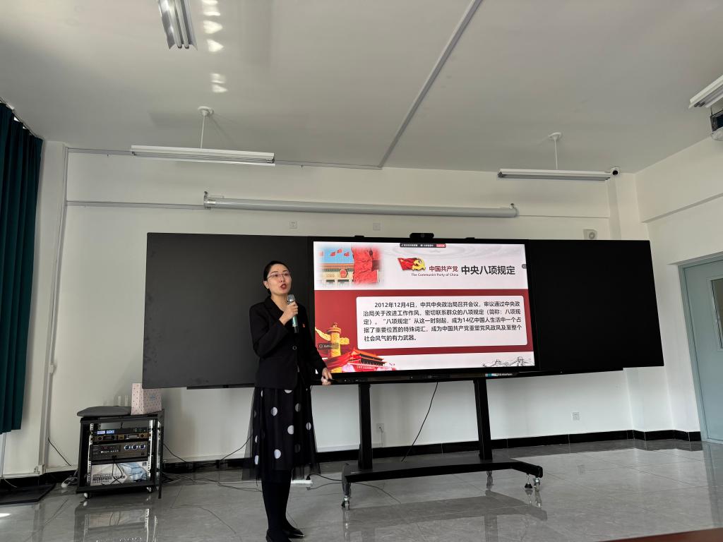 党课伊始,马艺铭副书记详细阐述了中央八项规定的出台背景。她指出,党的十八大以来,面对党内存在的形式主义、官僚主义、享乐主义和奢靡之风等突出问题,党中央以制定实施中央八项规定开局破题,以“小切口” 推动 “大变局”,开启全面从严治党的新征程。中央八项规定的出台,是党中央为加强自身建设、密切联系群众作出的重大决策,彰显了党以钉钉子精神纠治 “四风” 的坚定决心。随后,其深入解读了中央八项规定的主要内容,强调每一项规定都切中要害,直指作风建设的关键环节,是党员干部必须严格遵守的行为准则。为了让党员教师更直观地认识到违反中央八项规定精神的严重后果,马艺铭副书记结合高校实际,列举了多起高校违反中央八项规定精神的反面案例。这些案例涉及违规公款吃喝、违规发放津补贴、违规使用公务用车等问题,深刻警示全体党员要以案为鉴,时刻绷紧纪律之弦,守住廉洁底线。在党课的最后,就如何贯彻落实中央八项规定精神方面,马艺铭副书记对全体党员教师提出了明确要求。她强调,高校党员教师要提高政治站位,深刻认识中央八项规定精神的重大意义,将其内化于心、外化于行;要发挥模范带头作用,在教育教学、科研管理等工作中严格自律,坚决抵制不正之风;要立足本职岗位,将中央八项规定精神融入到日常工作中,以优良的作风推动高校教育事业高质量发展。