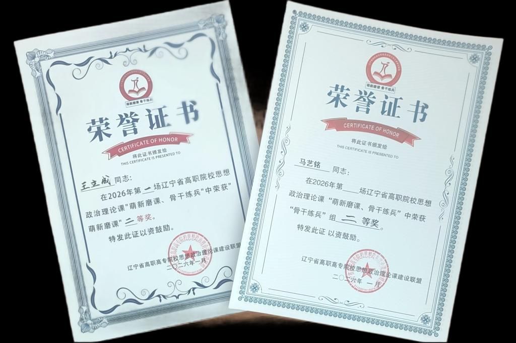 春风化雨润课堂,铸魂育人展风采。在2026年辽宁省高职高专院校思想政治理论课第一场“萌新磨课、骨干练兵”教学展示活动中,我校马克思主义学院青年教师王立成、马艺铭凭借扎实的理论功底、新颖的教学设计和富有感染力的课堂表达,分别荣获“萌新组”和“骨干组”二等奖,充分展现了我校思政课教师队伍的教学水平与精神风貌。